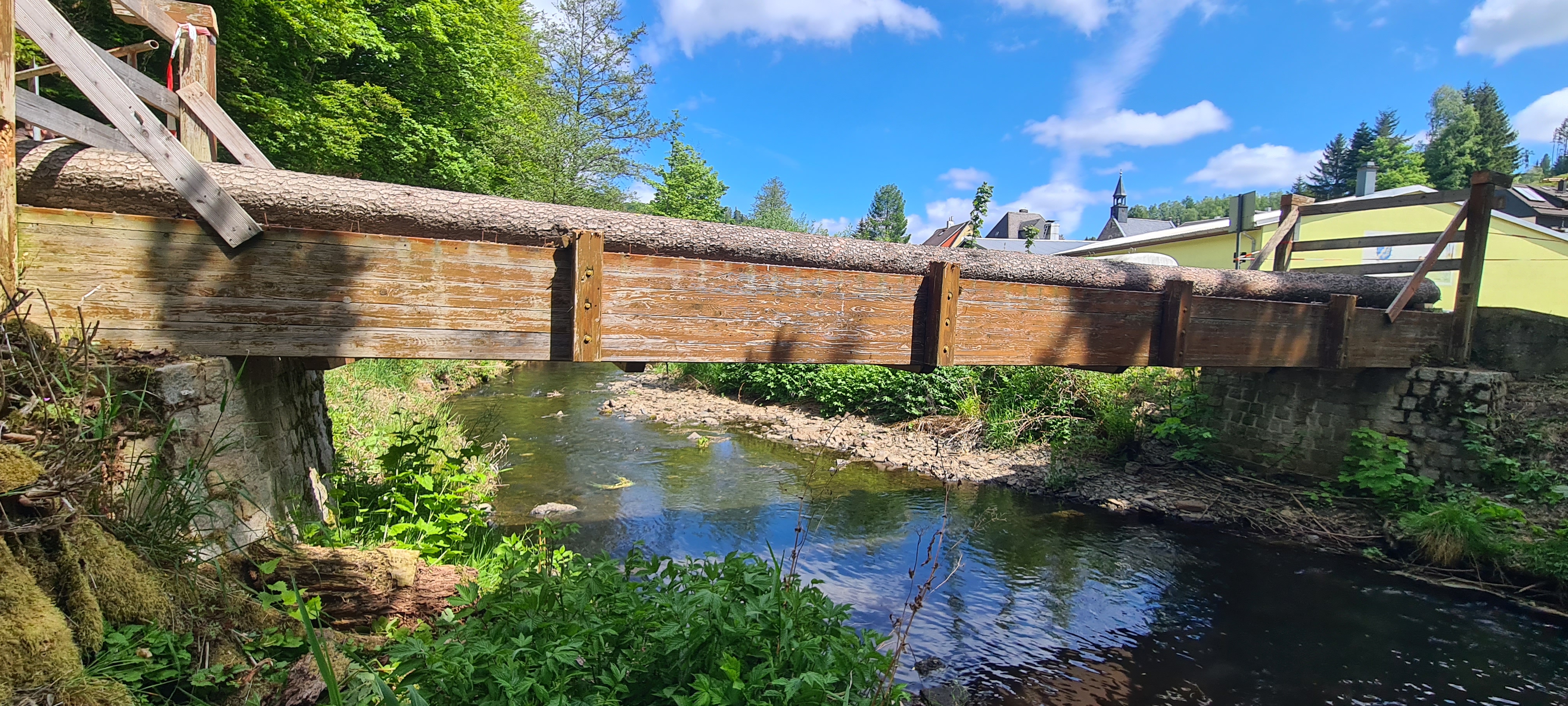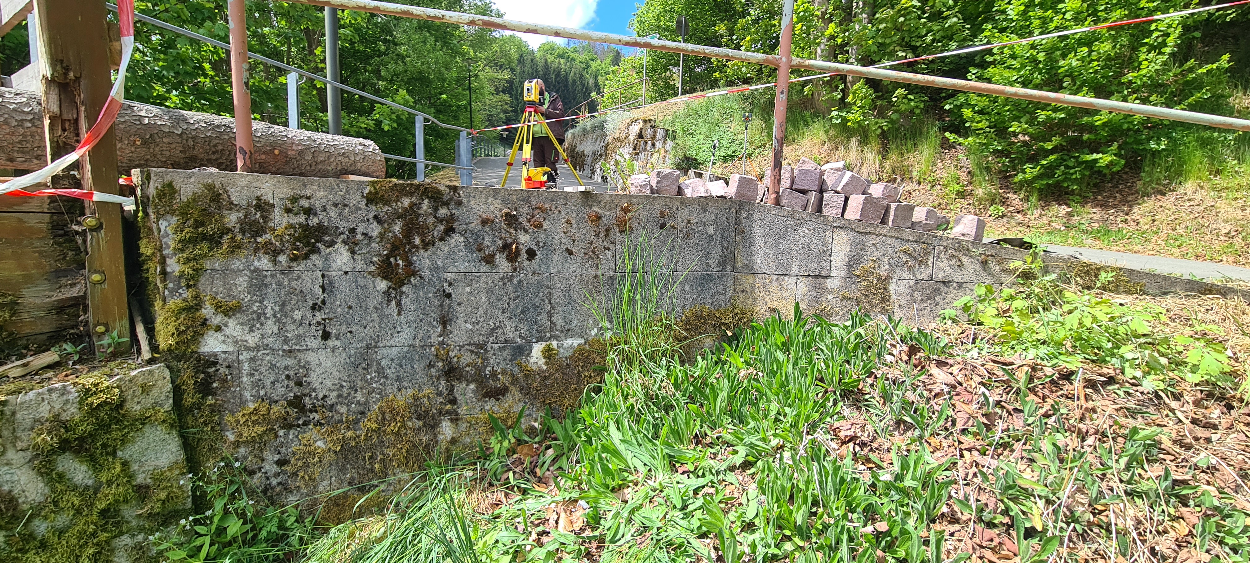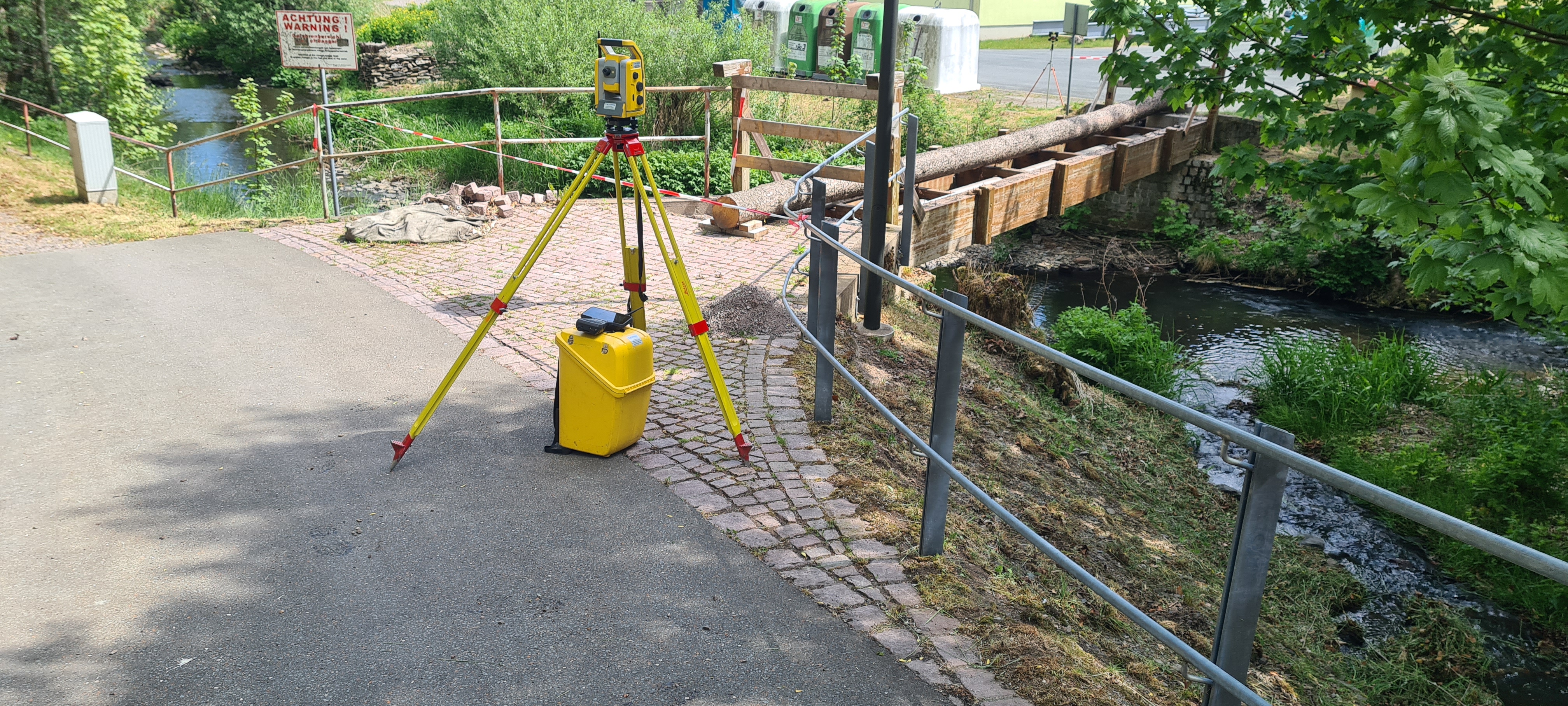 Für den Neubau der Brücke wurden sowohl das Gewässer als auch die bestehende Brückenkonstruktion präzise vermessen. Dabei kam moderne 3D-Messtechnik zum Einsatz, unter anderem mit der Trimble SX12.